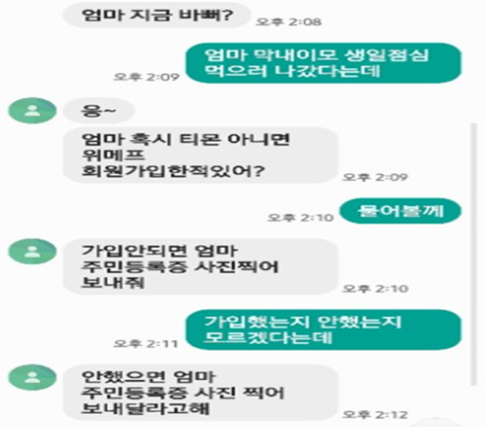"엄마, 혹시 OO(이커머스) 회원가입한 적 있어? 가입 안되면 엄마 주민등록증 사진 찍어서 보내줘"