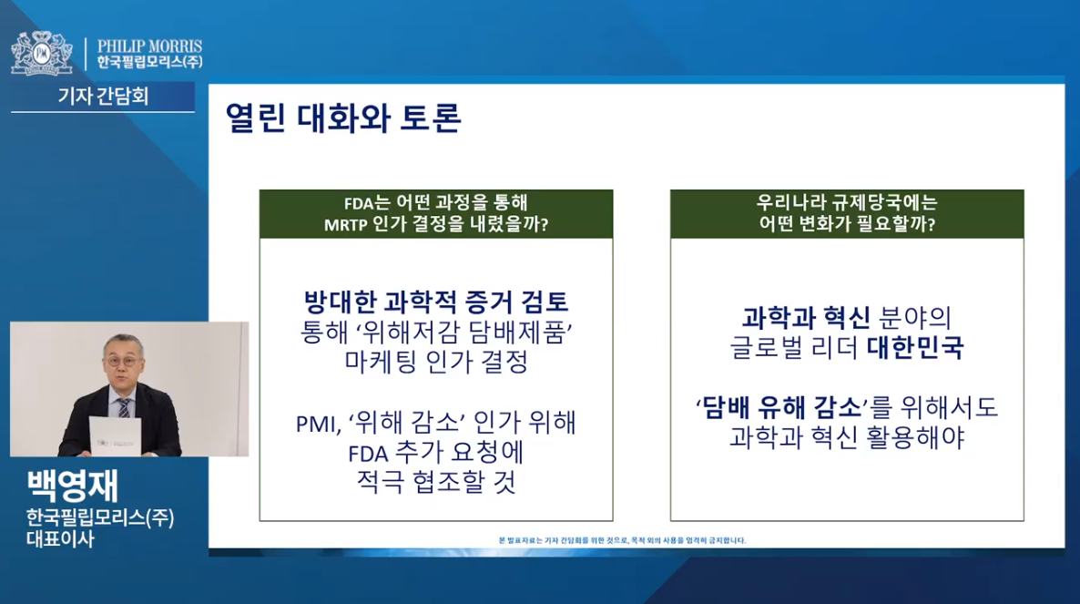 10일 관련 업계에 따르면 백영재 한국필립모리스 대표는 전날 온라인 간담회를 개최하고 "FDA가 과학적 증거를 검토한 결과 아이코스를 유해물질 노출감소 주장이 가능한 위해저감 담배제품으로 지난 7월 인가했다"며 "우리 정부도 과학적 근거에 기반해 전자담배 기기에 대한 합리적 규제를 실천해야 한다"고 말했다.