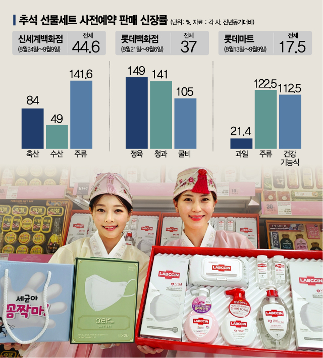 롯데백화점은 올해 추석 선물세트 사전예약 판매가 지난해 같은 기간 대비 37.5% 증가했다. 카테고리별로는 한우를 중심으로 한 정육 선물세트가 149%, 청과 141%, 굴비 105%로 모두 지난해보다 2배 이상의 판매 실적을 거뒀다. 현대백화점은 지난달 14일부터 9일까지 지난해 같은 기간보다 추석 선물세트 판매가 88.6% 증가했다. 특히 이 기간 40만원 이상의 한우 선물세트는 131.3%, 30만원 이상의 굴비 선물세트는 96.1% 매출 신장률을 기록했다.
