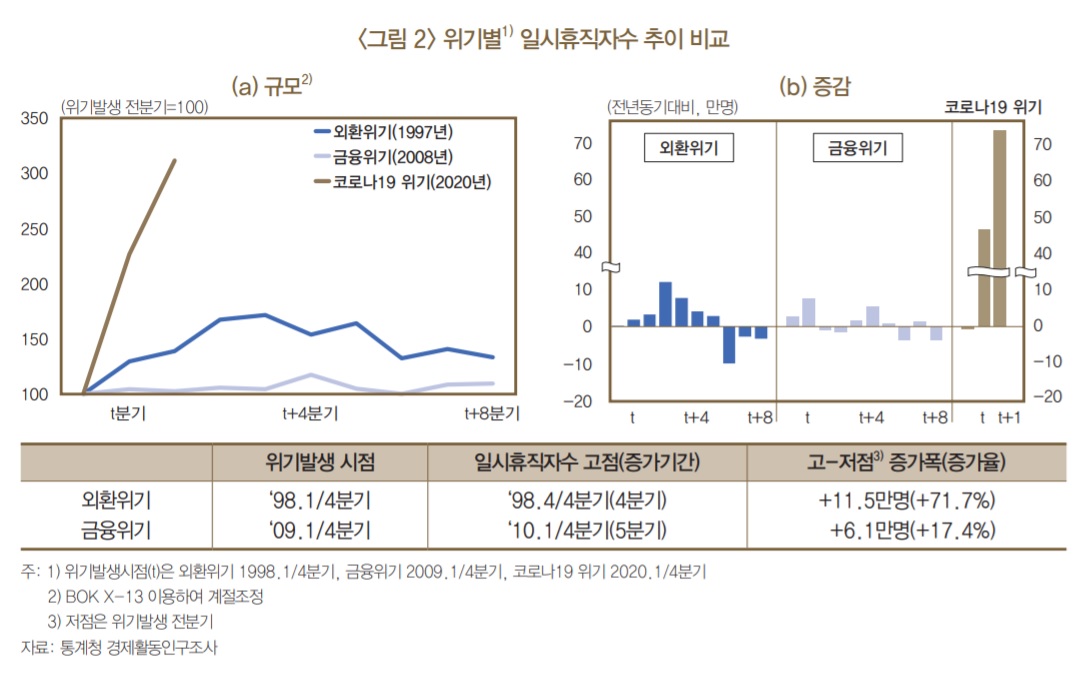 한은에 따르면 올해 2분기(4~6월) 일시 휴직자 수는 1년 전 같은 기간보다 73만 명 증가한 것으로 나타났다. 이는 글로벌 금융위기 때 늘어났던 일시 휴직자 수의 10배에 이르는 규모다. 외환위기 때와 비교해도 6배가 넘는다. 일시 휴직자는 일시적인 병이나 사고, 육아 등으로 조사 기간에 일하지 못했지만 휴직 이유가 해소되면 복직 가능한 사람들을 의미한다. 만약 일시 휴직자들의 복직이 늦어질 수록 국내 경제에도 부담요인이 될 수 있다. 한은은 또다른 보고서에서도 "일시 휴직자 중 일부가 실업자로 전환될 수 있다"고 우려했다. 일시 휴직자의 복직이 지연되고 기업의 신규 채용도 축소되거나 연기될 수 있다고 덧붙였다.