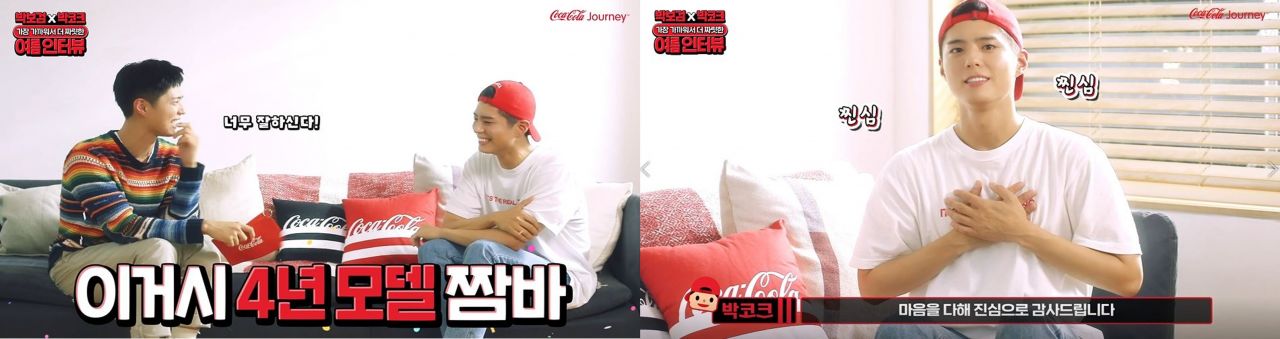 13일 코카콜라에 따르면 최근 공식 유투브 채널과 저니 홈페이지를 통해 공개된 박보검의 1인 2역 인터뷰 영상이 예측불허 역대급 매력을 발산하며 연일 팬들의 열띤 반응으로 화제다. 여기에 코카콜라가 추가로 잔망스러움 가득한 2번째 영상을 공개하며 팬들의 심장을 제대로 폭격하고 있다.