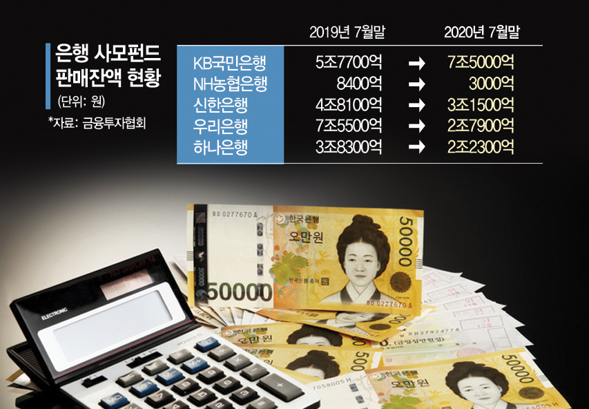 15일 금융투자협회 및 금융권에 따르면 올해 7월 말 기준 은행의 사모펀드 판매 비중은 5.10% 수준으로 1년 전 7.61% 대비 축소됐다. 같은 기간 증권업계 사모펀드 판매 비중이 82.02%에서 83.87%로 높아진 것과 대조적이다.5대은행 가운데 KB만 2조원 가까이 증가주요 5대 시중은행의 판매 성과는 펀드 사고 유무에 따라 더욱 극명하게 나뉘었다. 사모펀드 사태와 무관한 KB국민은행의 사모펀드 판매잔액은 7월 말 기준 7조5000억원으로 1년 전 5조7700억원 대비 2조원 가까이 급증했다.