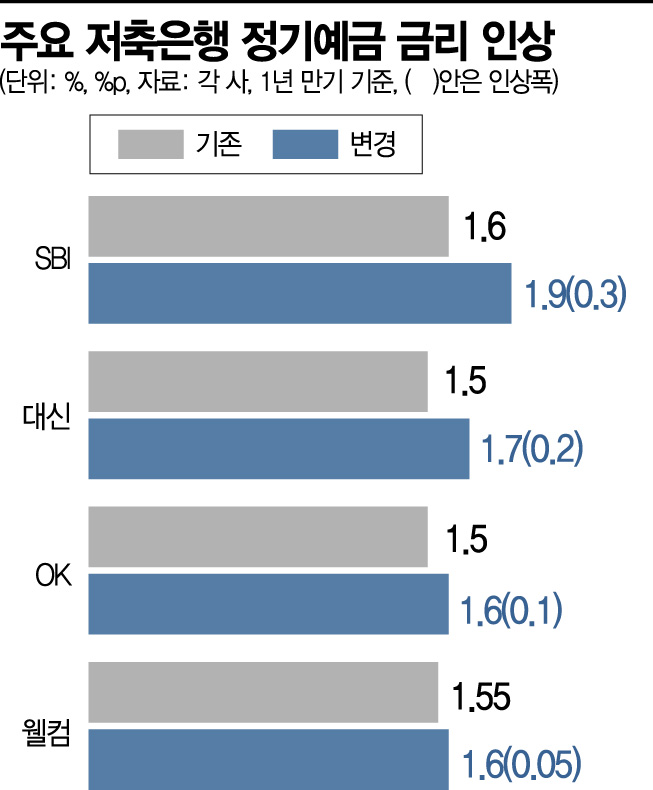업계 1위 SBI저축은행도 이달 들어서만 정기예금 금리를 두 차례 인상했다. 지난 1일 1년 만기 정기예금 금리를 기존 1.6%에서 1.7%로 0.10%포인트 올렸고, 이어 지난 11일 같은 상품 금리를 1.9%로 또 올렸다. 열흘 새 0.30%포인트나 올린 셈이다.