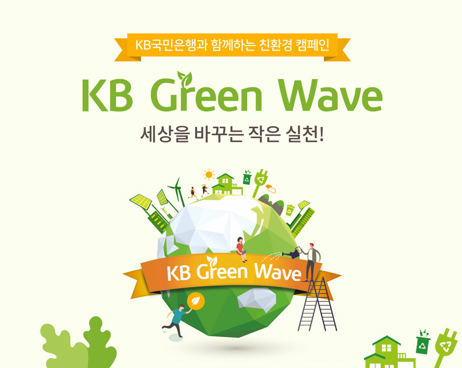 국민은행은 지난 6월부터 고객과 함께하는 KB 그린 웨이브 캠페인을 진행해 종이사용 줄이기, 전기사용 줄이기, 일회용품 줄이기 등 다양한 친환경 활동을 실천해왔다. 먼저 ‘종이통장 미발행 이벤트’에서는 계좌 신규 시 통장을 발행하지 않은 고객과 종이통장을 사용하지 않기로 한 고객에게 선착순으로 경품을 지급했다. 고객 참여도가 높아 추가 이벤트도 진행될 예정이다.