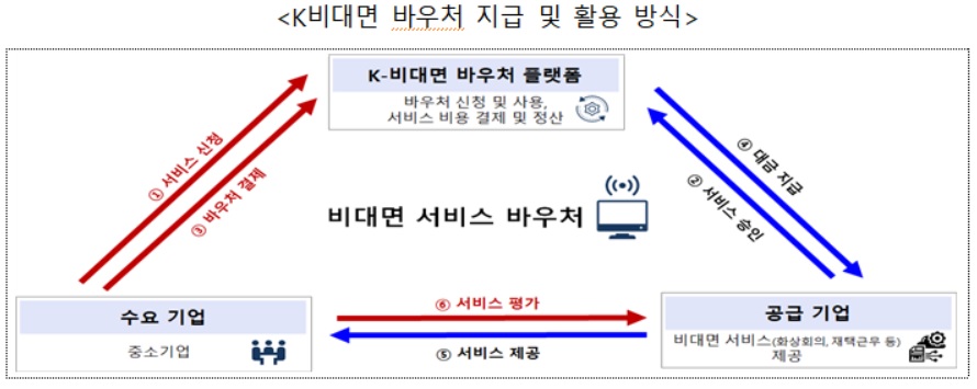 K비대면 바우처 플랫폼이 우리나라 언택트 서비스 시장 활성화의 거점이 되도록 할 방침이다. 채무 불이행, 국세 및 지방세 체납 등 지원 제외 사유에 해당하지 않으면 어떤 중소기업이라도 플랫폼에 접속해 비대면 서비스 바우처 사업 참여를 신청할 수 있다. 수요기업으로 선정되면 공급기업이 제공하는 서비스를 400만원 한도(자부담 10% 포함)에서 이용할 수 있다.