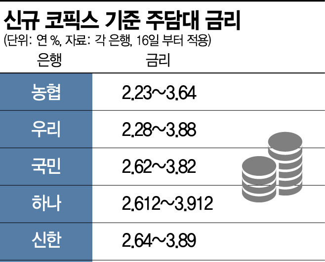2012~2013년 50~60%에서 2017~2018년 70%대까지 올랐던 변동금리 비중은 지난해 50%대 초반을 유지하다가 올 들어 다시 치솟고 있다. 기준금리 인하로 시중은행 대출금리도 크게 떨어져 고정금리 대출보다 변동금리가 더 싸지는 금리 ‘역전현상’이 나타난 것이다. 특히 주택담보대출 변동금리가 연 2%대 초반까지 내려 많은 소비자들이 변동금리 상품을 찾고 있는 것으로 전해졌다.저금리에도 조금씩 오르는 변동금리은행권에 따르면 NH농협은행은 신규 코픽스(COFIXㆍ자금조달비용지수) 기준 주담대 금리를 연 2.23~3.64%로 적용하고 있다. 우리은행도 같은 대출상품 금리를 2.28~3.88%로 설정해 최저금리가 2%대 초반이다. 하나은행(2.61%), KB국민은행(2.62%), 신한은행(2.64%)도 최저금리가 2%대 중반에 불과하다.