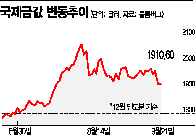 강달러 여파로 인해 금과 은, 원유 등 상품 가격은 줄줄이 떨어지고 있다. 수개월간 고공행진을 이어갔던 금값은 7월 이후 가장 낮은 수준으로 떨어졌다. 이날 미국 뉴욕상품거래소에서 12월 인도분 금 가격은 온스당 2.6% 떨어진 1910.60달러에 장을 마감했다. 지난 8월 2000달러 선을 넘어섰던 금값은 장중 1888.8달러까지 내려오면서 하락세를 보였다. 종가 기준으로는 지난 7월23일(1917.40달러) 이후 두 달여 만에 최저치다.