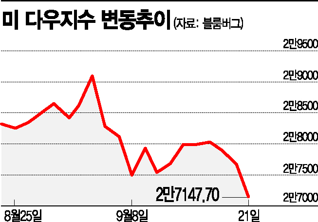 21일(현지시간) 뉴욕 증시에서 다우존스 30 산업평균지수는 509.72포인트(1.84%) 하락한 2만7147.70에, S&P500 지수는 38.41포인트(1.16%) 내린 3281.06에, 나스닥 지수는 14.48포인트(0.13%) 하락한 1만778.80에 거래를 마쳤다. 다우지수는 장중 한때 3% 이상 급락하는 등 지난 6월 이후 가장 큰 낙폭을 보였다.