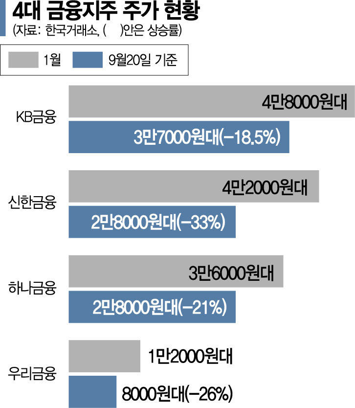 금융권 관계자는 "금융주는 전통적인 배당주로 인기가 많았지만 현재는 코로나19가 장기화하고 있는 데다 한국판 뉴딜 정책 지원 등으로 금융지주사들의 비용 부담이 늘면서 시장에서는 투자 매력이 떨어지고 있는 것으로 보고 있다"면서 "해외에서 직접 투자설명회(IR)를 개최하기도 불가능한 상황에서 금융당국이 금융사들에게 사실상 주가 부양 정책을 펴지 말라는 요구를 하고 있어 투자자 유치가 어려워질 수밖에 없다"고 토로했다.