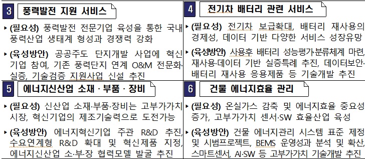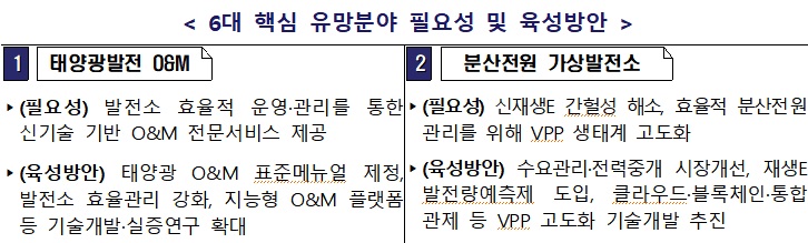 정부는 태양광 O&M, 분산전원 가상발전소, 풍력 지원서비스, 전기차배터리 서비스, 에너지신산업 소재·부품·장비, 건물 에너지효율 관리 등 6대 유망분야를 집중 지원한다.