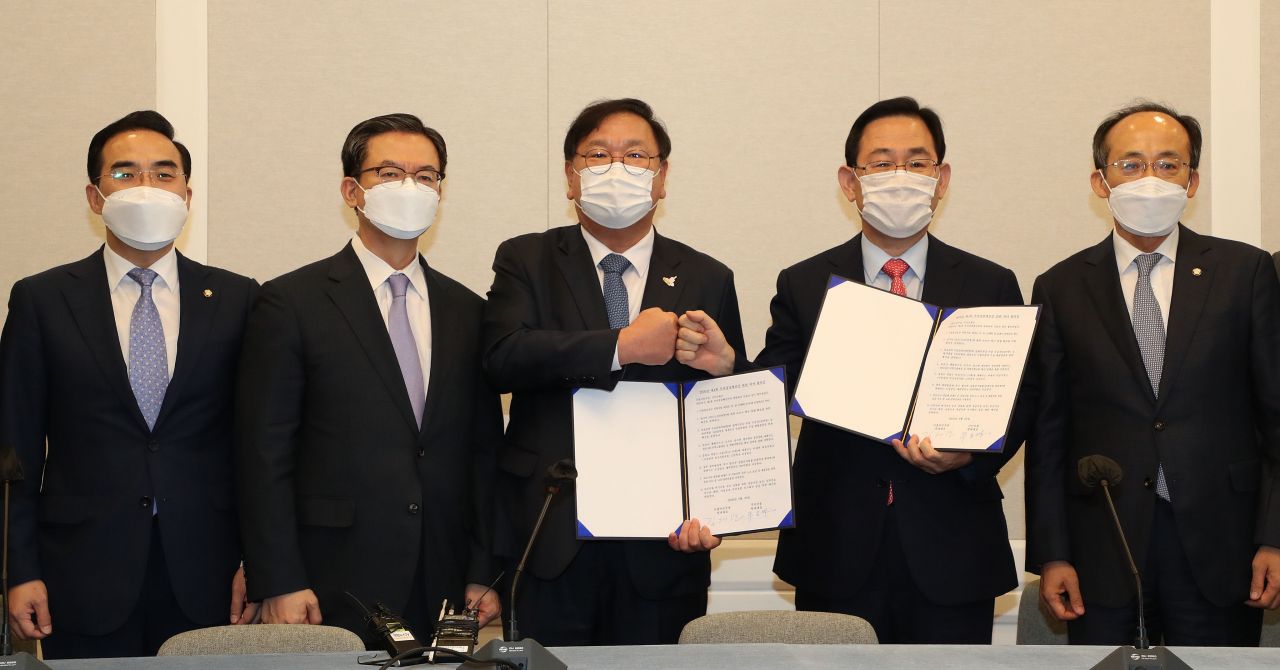 22일 국회에서 김태년 더불어민주당 원내대표와 주호영 국민의힘 원내대표가 4차 추가경정예산안 관련해 합의를 마친 후 합의문에 서명 후 포즈를 취하고 있다. 여야는 통신비를 나이에 따라 선별 지원하고 중학생도 아동특별돌봄비를 지급하는 등의 내용에 합의했다./윤동주 기자 doso7@