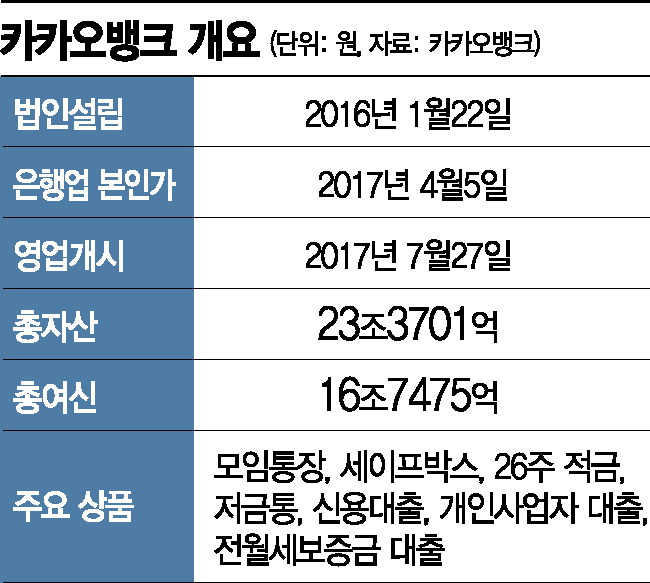 연체율(0.22%)도 낮은 편이다. 지난달 말 기준 수신 잔액 22조3159억원, 여신 잔액 18조3257억원이다. 모바일 앱으로 간단하게 대출가능 여부와 한도를 알려주는 신용대출, 전월세 보증금대출, 비상금대출, 마이너스통장 대출 등이 주요 포트폴리오다. 수신상품으론 매주 저금액을 달리하는 ‘26주 적금’, 체크카드를 결제하면 5000원 미만 잔돈을 자동으로 저금해주는 ‘저금통’ 등 저축하는 습관과 재미를 동시에 느낄 수 있는 상품이 주를 이룬다.공모주 바람타고 주가 대박?증권업계에서는 카카오뱅크가 이르면 내년 상반기에 본격적인 상장 절차를 밟을 것으로 예상하고 있다. 카카오뱅크는 인터넷은행 선두주자인 데다 모기업 카카오(지분 33.53%)를 등에 업은 만큼 IPO 대어로 꼽혀왔다.