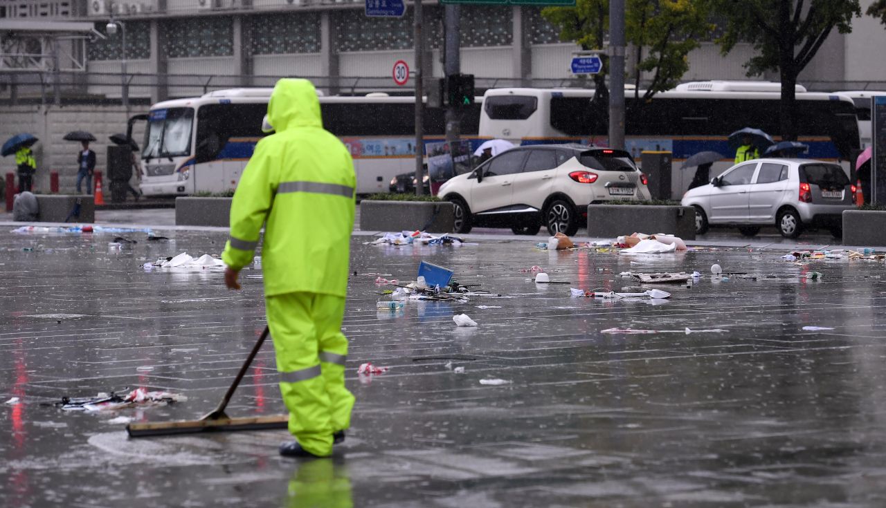 전국 대부분 지역에 비가 내린 7일 서울 광화문광장에서 환경미화원이 전날 행사에서 나온 쓰레기를 치우고 있다./김현민 기자 kimhyun81@