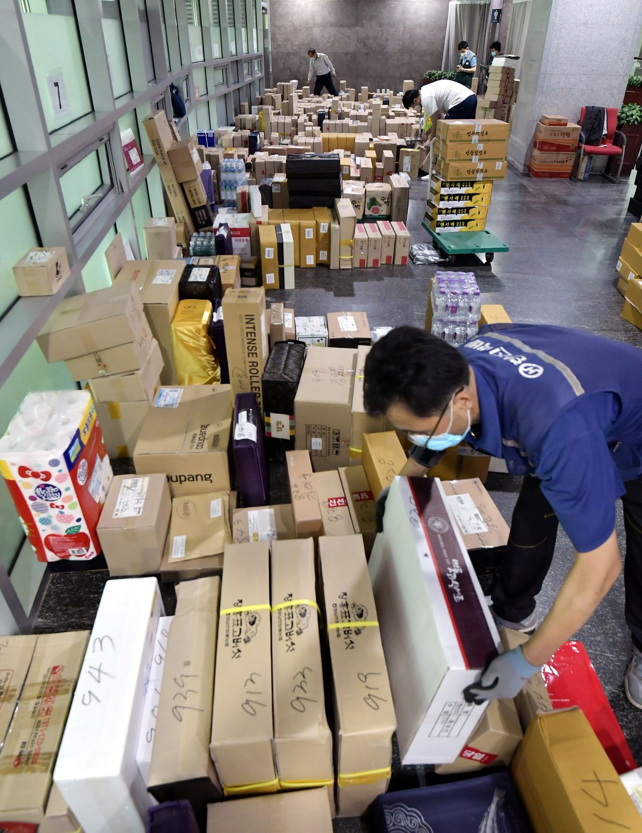 추석을 앞 둔 21일 국회 의원회관 로비에 명절 선물 택배가 쌓여 있다./윤동주 기자 doso7@