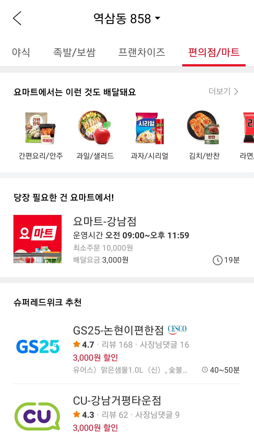요기요 앱의 '요마트' 화면 캡쳐. 주소지를 '강남역'으로 설정한 후 편의점/마트 화면에 들어가자 요마트-강남점 관련 배너가 최상단에 배치돼 있다.