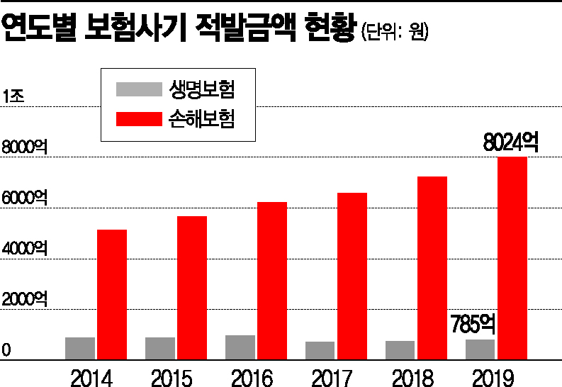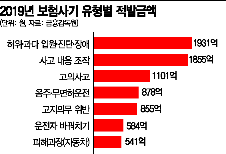 보험사기 적발금액은 지난해 8809억원에 달했다. 해마다 최대치를 경신 중이다. 연간 상승추세를 감안하면 올해엔 1조원에 육박할 것으로 추정된다. 지난해 적발된 보험사기 유형 중 가장 많은 것은 '허위ㆍ과다 입원ㆍ진단ㆍ장애'로 1931억원을 기록했다. 사고 내용 조작(1855억원)이나 고의사고(1101억원)도 적발금액이 1000억원대가 넘어섰다.