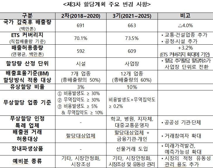 내년부터 2025년까지 도입할 3차 계획의 특징은 2차 계획(2018~2020년 적용)보다 배출권 허용 총량을 늘리되 기업이 돈을 주고 사야 하는 유상 할당 비중을 확대하고, 온실가스를 덜 배출하는 기업에 유리한 평가 체계를 구축한 점이다. 총 6억970만t의 배출권을 허용하되 유상 할당 비중을 3%에서 10%로 늘린다. 유상 할당이란 환경부가 할당한 배출권 거래 대상 기업이 경매 등을 통해 배출권을 구매하는 방식을 의미한다. 온실가스를 많이 내뿜는 기업일수록 부담이 커지는 구조다.