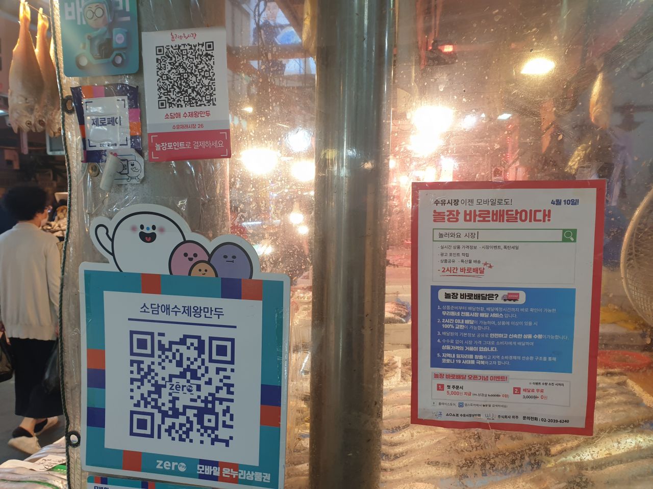 반짝 대목에도 활짝 웃지 못하는 대형마트, 백화점과 달리 전통시장에는 활기가 돌았다. 수유재래시장에는 전과 떡, 송편, 김치, 나물류, 야채 청과, 차례상 제수용품 외에도 시장 명물 빨간 홍어회무침과 꼬마김밥, 꽈배기, 만두 등 먹거리 코너에 긴 줄이 세워졌다. 모처럼 활기를 띈 전통시장은 디지털 혁신이 한창이다. 시장 곳곳에는 '카드 사용 가능', '온누리 상품권', '제로페이'를 비롯해 '놀장(놀러와요 시장) 앱 사용처', '배달의민족' 등 서비스 홍보 문구들이 붙어 있었다.