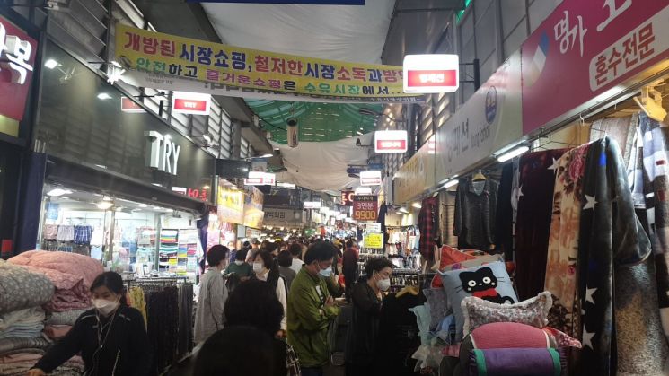 지난 28일 오후 4시경 수유재래시장의 모습. 추석 명절 전 손님들이 장을 보고 있다. 현수막에는 '신종 코로나바이러스감염증(코로나19)으로부터 안전하다'는 내용의 시장 홍보 문구가 적혀있다.