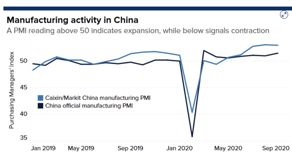 PMI는 경기를 파악하는 데 중요한 선행 지표로 기준선인 50을 넘으면 경기 확대, 넘지 못하면 경기 위축을 뜻한다. 최근 중국 경제는 계속해서 회복세가 이어지고 있는 것으로 평가된다. 중국의 제조업 PMI는 코로나19 충격이 가장 컸던 지난 2월 사상 최저인 35.7까지 급락했다가 3월부터는 50 이상을 기록하고 있다.