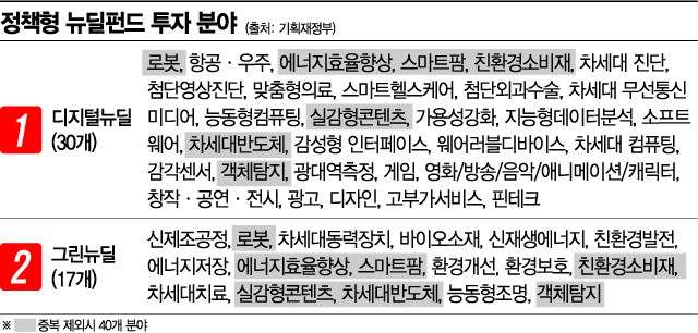 우선 정책형뉴딜펀드의 투자 분야로 정부는 로봇, 에너지효율향상, 스마트팜, 친환경소비재, 실감형 콘텐츠, 차세대반도체, 객체탐지, 게임, 항공ㆍ우주, 스마트헬스케어 등 40개(디지털ㆍ그린뉴딜 중복 제외)의 분야를 선정했다. 해당 기업이나 프로젝트 외에도 관련 도ㆍ소매나 운송, 소재나 부품 등 전ㆍ후방사업에도 투자가 가능하다.