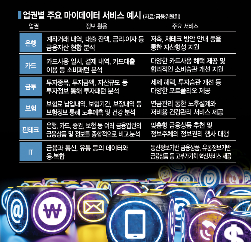 마이데이터 업체가 개인의 카드 거래내역, 보험정보, 투자정보 등을 분석해 유리한 금융상품을 추천해줄 수도 있다. 금융소비의 주도권이 금융회사에서 소비자로 넘어간다는 의미도 지니고 있다.