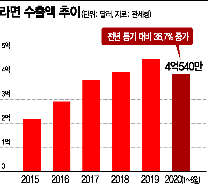 올해 들어 라면 수출은 폭발적으로 늘고 있다. 농림축산식품부가 올해 1~8월까지 누계 기준으로 집계한 결과 라면 수출액이 4억540만 달러로 전년 동기 대비 36.7% 급증했다. 미국(56.7%)ㆍ일본(48.9%)ㆍ중국(44.9%) 등 주요 수출 대상국의 증가율이 높았다. 올해 라면 누적 수출액은 전체 농식품 수출액의 8.4%에 해당해 한국 식품 수출 증가에 주도적인 역할을 하고 있다.