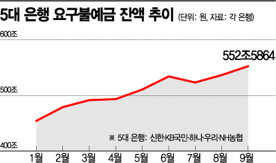 7일 금융권에 따르면 KB국민ㆍ신한ㆍ우리ㆍ하나ㆍNH농협은행 등 5대 시중은행의 지난달 요구불예금 잔액은 552조5864억원으로 집계됐다. 전월(536조6678억원) 대비 16조원 가량 증가했다. 은행 요구불예금은 수시입출금 예금, 수시입출금식 저축성예금(MMDA) 등 언제든지 입ㆍ출금할 수 있는 자금이다. 투자처를 찾지 못한 '대기 자금' 성격이 강하다. 금리도 0.1% 수준으로 거의 없다.