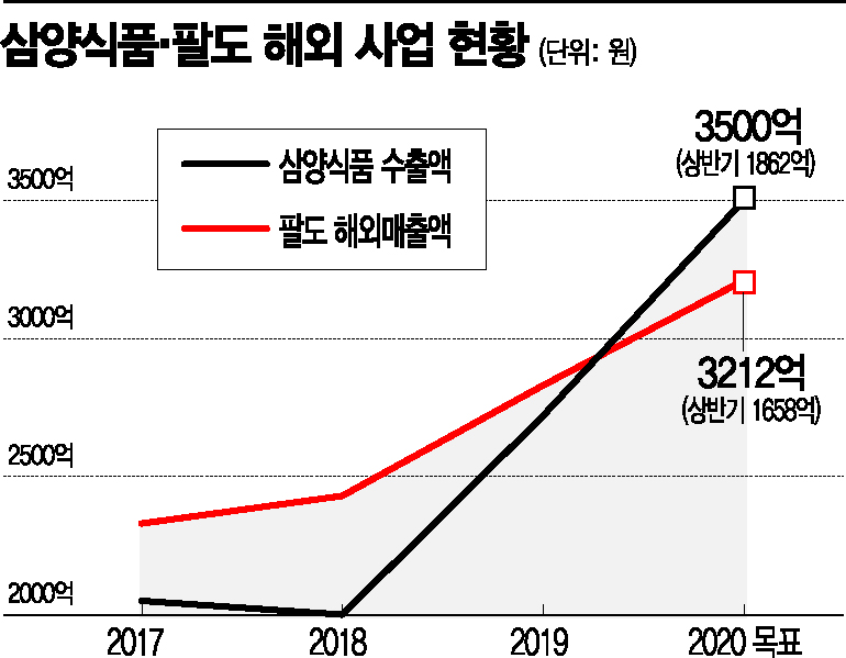삼양식품은 중국과 동남아, 팔도는 러시아에서 K라면 열풍을 이끌고 있다.중국ㆍ동남아 사로잡은 불닭볶음면 7일 삼양식품에 따르면 불닭 브랜드의 세계적인 인기에 힘입어 해외 매출은 최근 3년새 3배 가까이 성장했다. 전체 매출에서 차지하는 비중도 50% 늘었다. 해외 생산공장 없이 수출 물량 전량을 국내에서 생산하는 삼양식품은 2017년 1억달러, 2018년 2억달러 수출을 달성하며 현재 한국 라면 수출의 절반을 책임지고 있다.