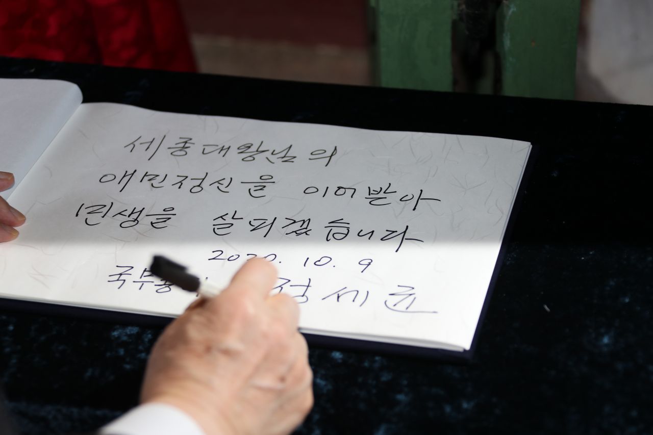 정 총리는 "세종대왕은 늘 백성을 먼저 생각했다. '내가 꿈꾸는 태평성대는 백성이 하려고 하는 일을 원만하게 하는 세상'이라고 말씀하셨다"며 "숱한 어려움을 극복하고 문화융성 시대를 열었던 것도 애민정신의 힘 덕분"이라고 설명했다.