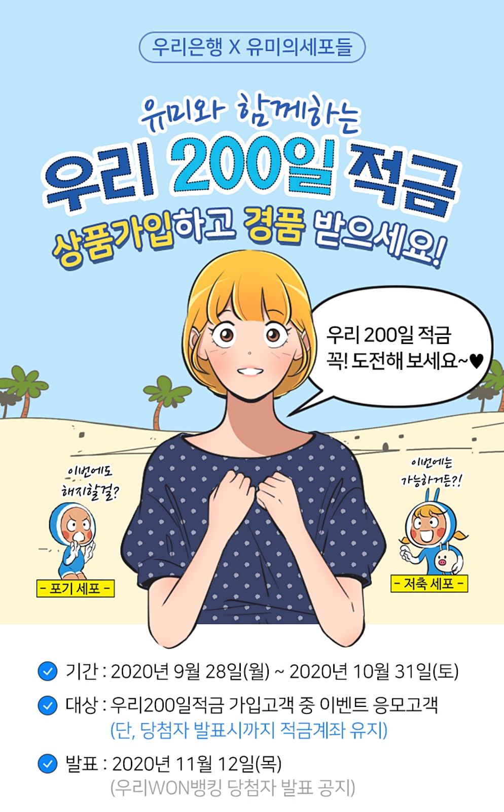 우리은행×유미의 세포들 캘래버, ‘우리 200일 적금’ 출시우리은행은 네이버웹툰에 연재 중인 ‘유미의 세포들’과 협업해 우리WON뱅킹 앱에서 웹툰 방식의 새로운 인터페이스를 도입한 ‘우리 200일 적금’을 출시했다.