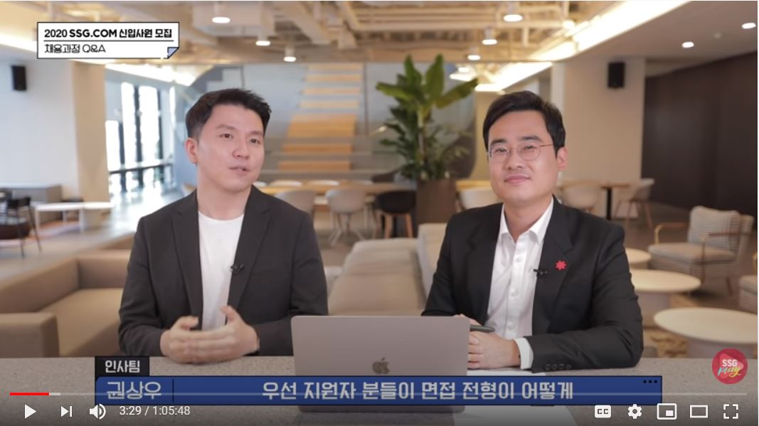 채용설명회의 뉴노멀 '온라인'신세계그룹의 e커머스 기업 에스에스지닷컴(SSG닷컴)의 실시간 온라인 채용설명회 영상은 지난 7일 자체 유튜브 채널에 업로드된 이후 이날(11일) 기준 나흘만에 조회수 1만7278뷰를 기록했다. 좋아요는 '271개'를 받았다. 실시간 설명회가 진행되는 동안에는 채팅창을 통한 쌍방향 질문응답(Q&A)도 이뤄졌다. 주요 직군인 상품기획자(MD) 및 마케터, 서비스기획 부문 파트너와의 인터뷰 및 현직자 '브이로그(Vlog)'도 담았다.
