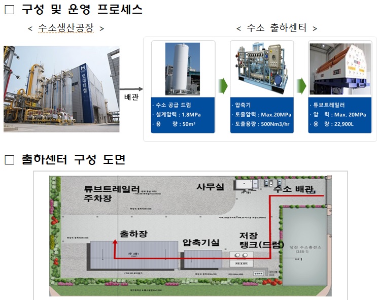 센터는 수소 생산 공장인 현대제철에서 만들어진 수소를 저장했다가 수소튜브트레일러에 고압(200bar)으로 적재하는 역할을 하게 된다. 이는 수소 유통 과정에서 필수적인 시설이다.