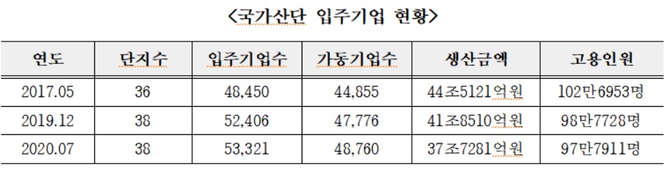 13일 국회 산업통상자원중소벤처기업위원회 소속 한무경 국민의힘 의원이 한국산업단지공단으로부터 제출받은 자료에 따르면, 2017년 5월 기준 국가산단 입주기업은 4만8450개였지만 올해 7월 기준 5만3321곳으로 9.8% 증가했다.