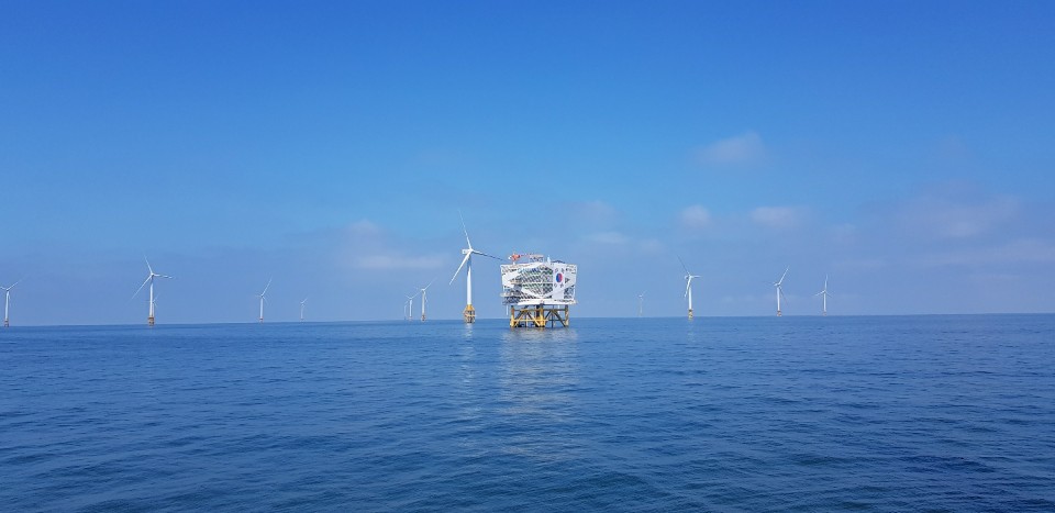 전라북도 고창군 상하면 구시포항에 있는 서남해 해상풍력 실증단지 모습. 가운데 네모난 장치가 해상변전소.(사진제공=한국해상풍력)