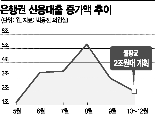 이들 은행은 지난해와 올해 신용대출 잔액 현황과 증가율 관리 목표 등의 구체적 자료를 금감원에 제출하면서 10~12월 증가액 목표치를 ‘2조원대’로 못 박은 것으로 알려졌다.