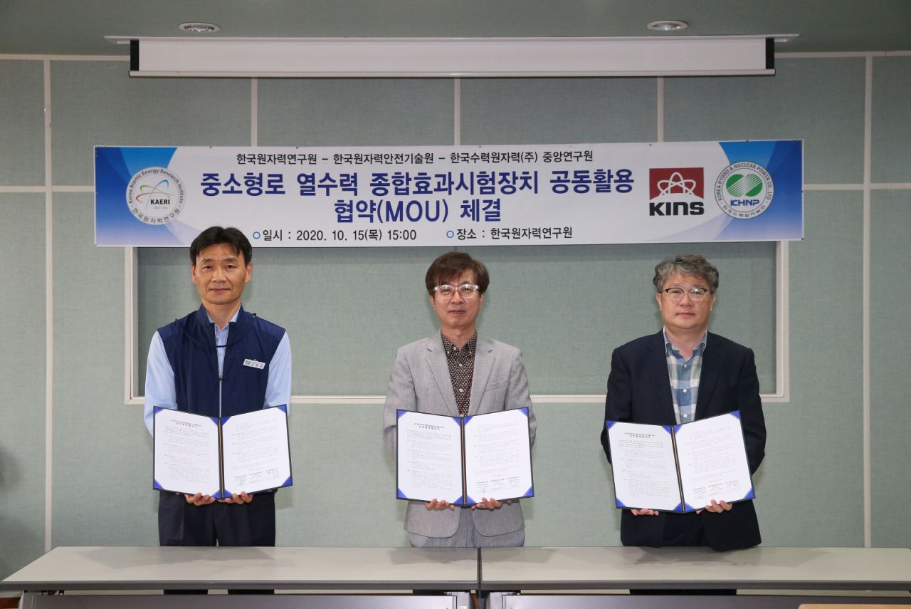 한국원자력연구원과 한국원자력안전기술원(KINS), 한국수력원자력이 'FESTA' 공동활용을 위한 협약을 체결하는 모습. 왼쪽부터 김용학 한수원 플랜트설계연구소장, 박진호 원자력연 원자력안전연구소장, 정규환 KINS 안전연구단장.(사진제공=한국원자력연구원)