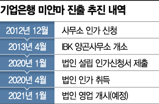 13일 금융권에 따르면 IBK기업은행은 내년 1월 기존 IBK양곤사무소를 IBK미얀마 법인으로 변경해 출범할 예정이다. 앞서 지난 4월 현지 중앙은행으로부터 법인 설립 예비인가를 받은 뒤 법인 전환을 위한 준비가 한창이다. 관련 내용을 지난달 연 이사회에 보고한 뒤 승인도 받았다.