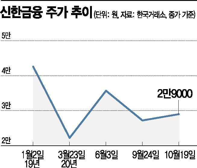 지난해 말 4만원 중반대를 오르내렸던 신한금융 주가는 올 3월 2만원 초반대로 떨어지며 반토막이 났다. 6월 반짝 회복세를 보이는가 싶었으나 현재까지 3만원을 넘지 못하며 지지부진한 모습을 보이고 있다.