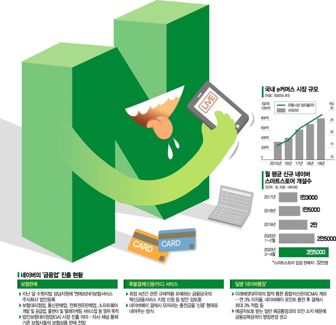 ◆롯데ㆍ신세계도 네이버 쇼핑에 입점= 롯데는 온라인 쇼핑 플랫폼 '롯데온'에 총 3조원을 투자했다. SSG닷컴은 수천억 원을 투자해 물류센터를 건립하고 새벽 배송을 도입하며 디지털 전환에 속도를 내고 있다. 하지만 네이버가 '브랜드 스토어'를 선보이며 입지가 좁아졌다.