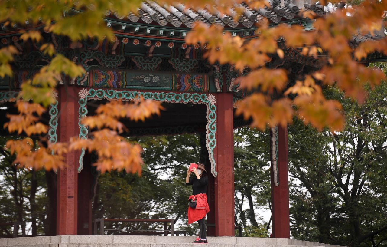 서울 중구 남산을 찾은 한 시민이 물들어가는 나무 아래에서 가을 정취를 만끽하고 있다./김현민 기자 kimhyun81@