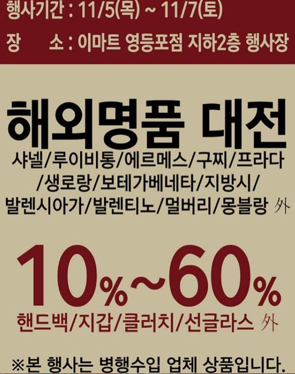 21일 유통업계에 따르면 이마트는 지난 7월부터 이마트 광주점, 죽전점 등 5개 점포에서 ‘해외명품 대전’ 행사를 진행했다. 해외명품 대전 행사는 이마트가 병행수입 업체를 통해 샤넬, 루이비통, 에르메스 등 해외명품 브랜드의 초고가 가방과 잡화 등을 최대 60%까지 할인하는 행사다.