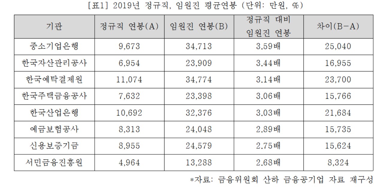 평균 임금을 기준으로 정규직과 임원진 임금 간 격차를 보면, 중소기업은행 임원진 평균연봉은 3억4713만원으로 정규직 전체 평균 연봉 9673만원 대비 3.6배가량 많았다. 한국자산관리공사는 임원진이 2억3909만원을 받아 정규직 평균인 6954만원 보다 3.4배 이상이었다. 다음으로는 한국예탁결제원, 한국주택금융공사, 한국산업은행 순이었다.