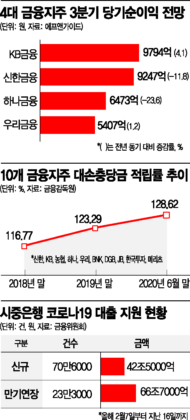 은행들이 대손충당금 적립에 열을 올린 것도 이 때문이다. 금융감독원에 따르면 은행의 대손충당금 적립비율은 올해 1분기 110.6%에서 2분기 121.2%로 높아졌다. 상반기 은행들의 대손비용은 3조3000억원으로 지난해 같은 기간보다 2조원 늘었다. 2분기에만 하나은행이 약 3500억원, 우리ㆍ신한은행은 2700억원, KB국민은행이 1400억원, NH농협은행이 1800억원의 충당금을 쌓았다. 최정욱 하나금융투자 연구원은 "충당금 추가 적립이 4분기 이슈될 가능성이 높다"고 내다봤다.대부분이 중소기업인 한계기업, 즉 벌어들인 돈으로 이자비용도 감당하지 못하는 기업이 가파르게 증가하는 흐름도 은행권을 압박한다. 한국은행에 따르면 지난해 국내 한계기업은 3475곳으로 전년대비 239곳(7.4%) 늘어났다. 관련 통계가 작성된 2010년 이후 가장 높은 수준이다. 2018년 12월 3.1%였던 한계기업의 예상 부도확률이 올 6월 중 평균 4.1%로 상승하는 등 신용위험 또한 높아졌다.4대 지주 순이익 선망 전망이런 가운데 주요 금융지주의 3분기 실적은 대체로 '선방'이 예상된다. 금융정보업체 에프앤가이드에 따르면 증권사들이 내놓은 KBㆍ신한ㆍ하나ㆍ우리 등 4대 금융지주의 3분기 순이익 합산 전망치는 약 3조900억원 수준이다. 지난해 같은 기간(3조2400억원)에 견주면 4.7% 가량 낮지만 올해 1ㆍ2분기보다는 개선돼 코로나19 국면을 고려하면 호실적에 해당한다는 평가다.