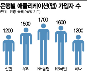 22일 은행권에 따르면 KB국민ㆍNH농협ㆍ신한ㆍ우리ㆍ하나 등 5대 은행의 9월 말 현재 총 고객 수 대비 은행 앱 이용자 수는 54%를 기록했다. 고객의 절반 이상이 은행 앱을 사용하고 있는 것이다. 은행별로는 농협은행이 1700만명으로 가장 많았다. 국민은행 1600만명, 우리은행 1500만명, 신한과 하나은행이 각각 1200만명씩이었다. 5대 은행의 앱 이용자 수를 합하면 약 7200만명에 달하는 규모다. 전체 고객 수 대비 이용자 비중으로 보면 우리은행이 가장 높았다. 10명 중 7명(68%)이 앱을 이용하는 것으로 확인됐다.