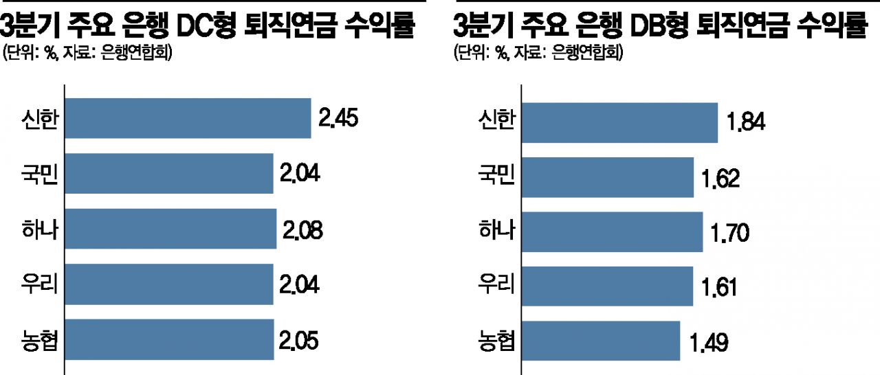 23일 은행연합회에 따르면 올해 3분기 5대 은행(신한ㆍKB국민ㆍ하나ㆍ우리ㆍNH농협은행)의 확정급여(DB)형 퇴직연금 수익률 평균은 1.65%로 집계됐다.