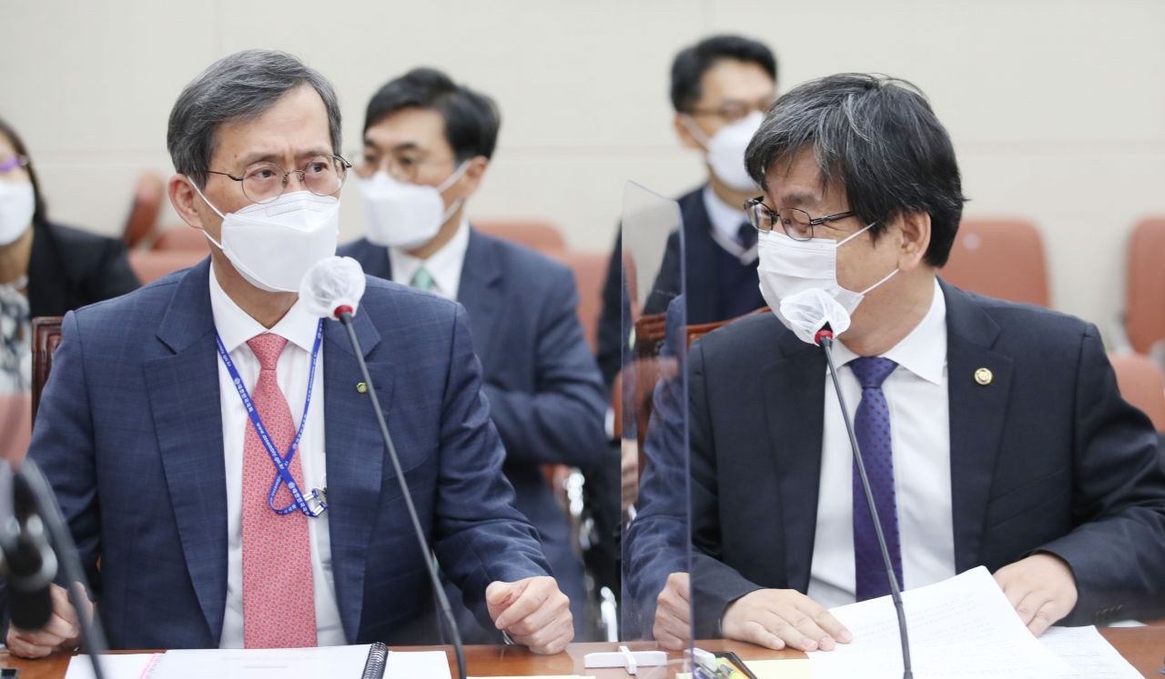 정재훈 한국수력원자력 사장(왼쪽)과 엄재식 원자력안전위원회 위원장이 23일 서울 여의도 국회에서 열린 과학기술정보통신위원회 종합국정감사에 참석, 대화하는 모습.(이미지 출처=연합뉴스)