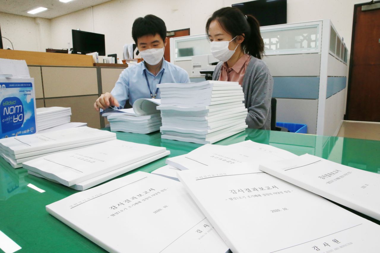 20일 국회 의안과에서 직원들이 감사원이 제출한 월성1호기 조기폐쇄 결정의 타당성 점검 감사결과보고서를 정리하고 있다. 이날 감사원은 월성 1호기의 조기폐쇄의 이유인 경제성이 불합리하게 낮게 평가됐다는 감사 결과를 발표했다. 다만 조기 폐쇄 타당성에 대해서는 종합적인 판단이 어렵다고 발표했다./윤동주 기자 doso7@