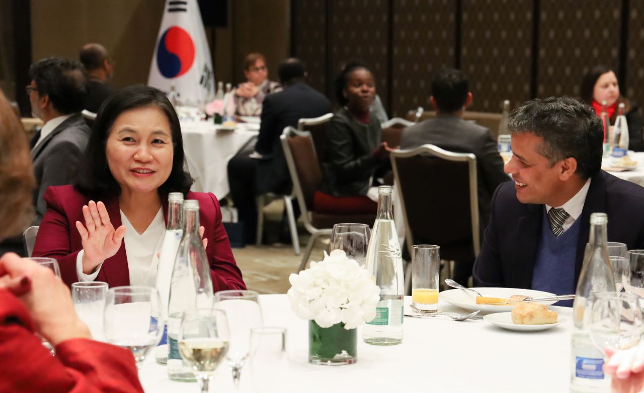 세계무역기구(WTO) 사무총장 선거 최종 라운드에 진출한 유명희 산업통상자원부 통상교섭본부장이 지난 16일(현지시간) 스위스 제네바 인터콘티넨탈 호텔에서 제네바 주재 각국 대사들을 초청해 개최한 리셉션에서 참석자들과 대화하고 있는 모습.(이미지 출처=연합뉴스)