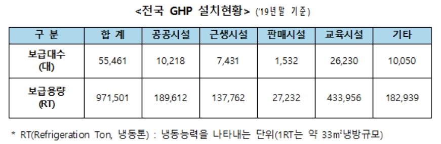 전국의 교육·공공·근생시설 등에 설치된 GHP는 약 5만5000대로 추산된다. 정부는 가스냉난방 보급확대 정책에 따라 설치지원 보조금까지 지급해왔다. 이 때문에 국회를 비롯한 공공기관도 적극적으로 GHP를 설치한 바 있다.